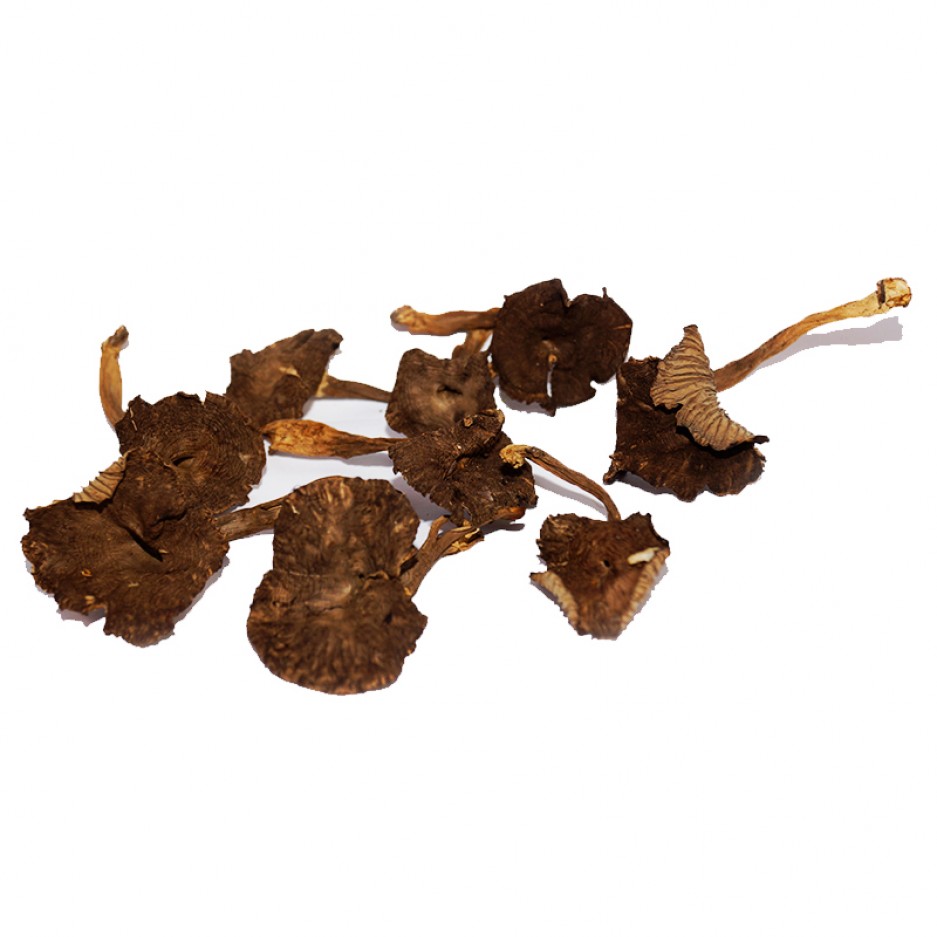 Descripción: De 2 a 5 cm de sombrero, plano o con forma de embudo, margen incurvado o lobulado. Pliegues bajo el sombrero en lugar de láminas, como todos los Cantharellus, de color grisáceo amarillento. Pie de color amarillo mate. Carne delgada, flexible y blanco-amarillenta, de olor y sabor agradables. Nota: Se diferencia de Cantharellus Lutescens por el margen incurvado y sobre todo por el color grisáceo del himenóforo, en contraste con el amarillo pálido de esta última.