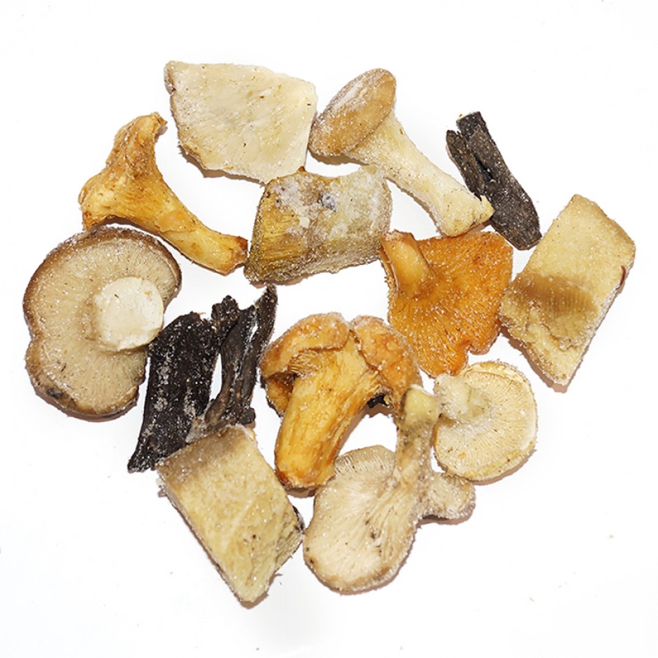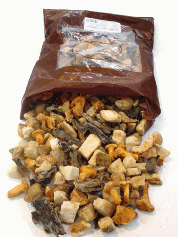 Boletus edulis 25%, Cantharellus Tubaeformis 25%, Suillus luteus 25%, Pleurotus Eryngii 15% y Cratherellus cornucopioides 10% .